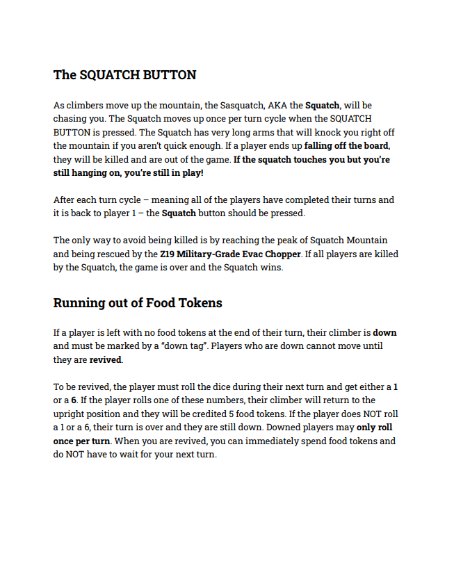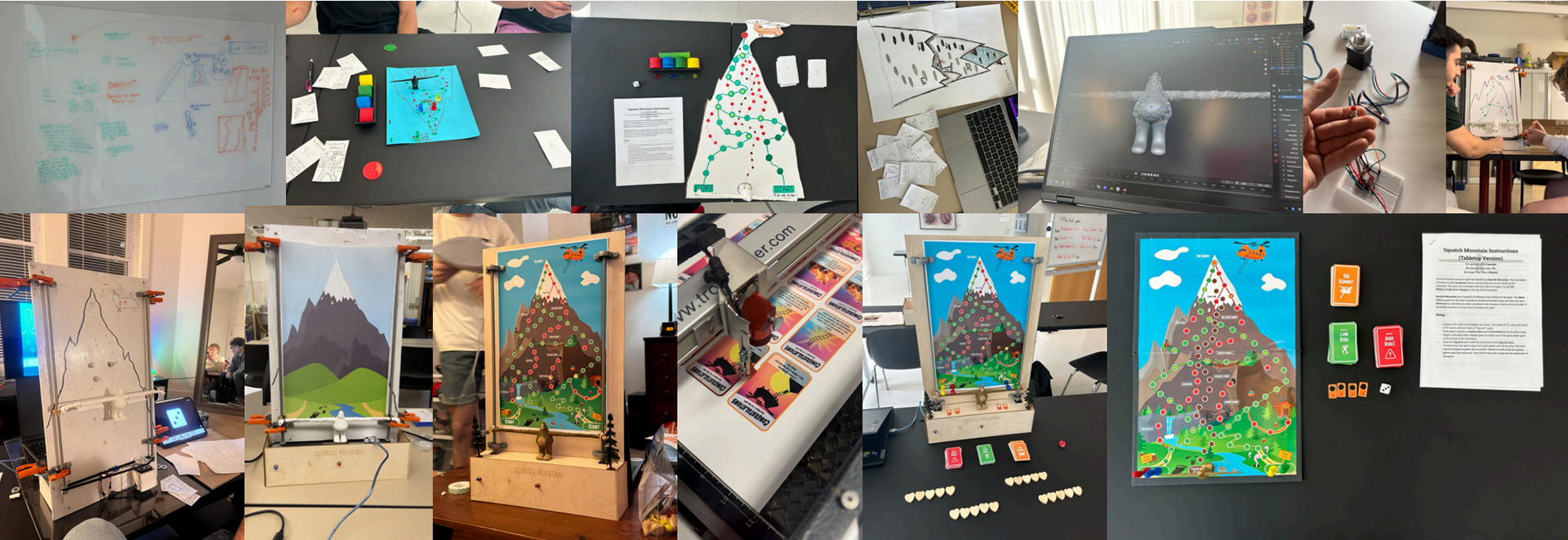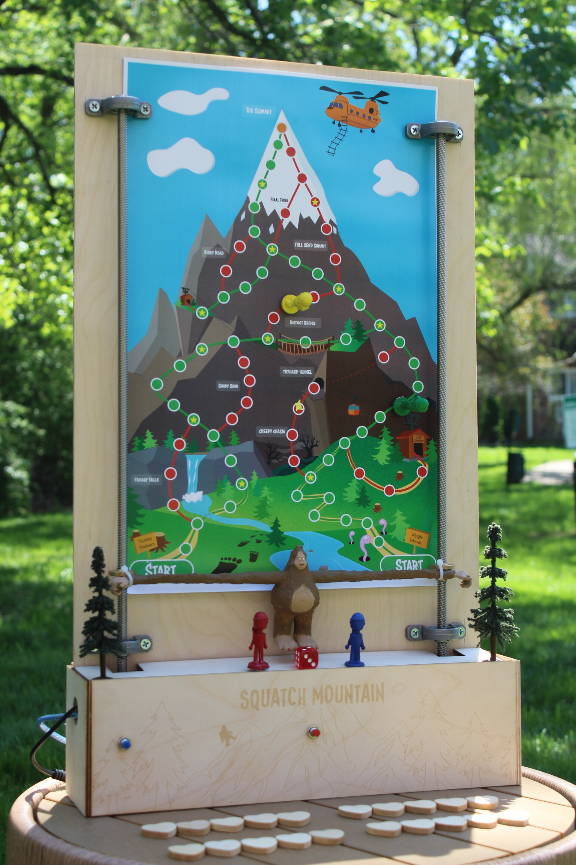 As part of a semester-long group project, we developed Squatch Mountain, an interactive board game designed to teach and reinforce core concepts in systems design and thinking. The objective of the game is for players to ascend a treacherous mountain while evading a mechanized Sasquatch in pursuit. The game integrates both physical and digital components. A custom-built Arduino system powers a stepper motor that moves the Sasquatch along the board. Players trigger its movement with the press of a button, introducing timed pressure and system-based uncertainty into the gameplay. The game board features two divergent paths: one high-risk/high-reward and the other low-risk/low-reward, encouraging strategic decision-making. Throughout the climb, players collect cards that introduce balancing and reinforcing loops, which dynamically affect outcomes and simulate feedback mechanisms found in real-world systems.