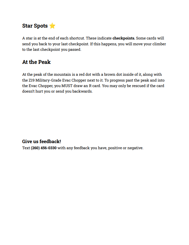 Each card type corresponds with the trail type they are on, with each having various risks and rewards, deciding the players fate. The cards were printed on cardstock, then laser-cut into final shape.