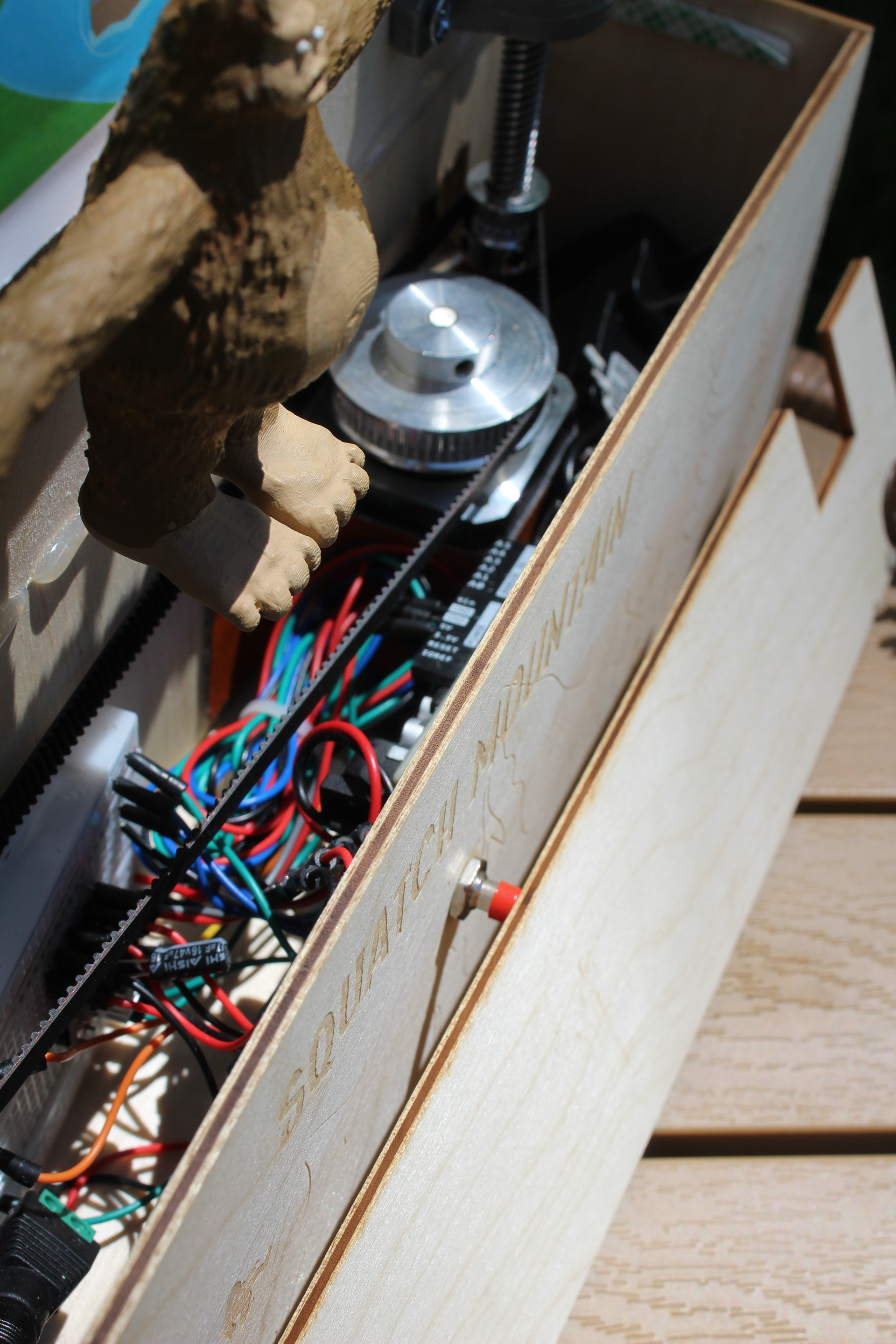 This image reveals the inner workings of our stepper motor system, powered by an Arduino microcontroller, which controls the Sasquatch’s elevation and descent in the game. The Arduino was programmed to generate random increments of motion, creating unpredictable ascension and descension patterns. This adds an element of suspense and excitement to the gameplay. Each press of the "Squatch" button triggers an uncertain outcome, keeping players engaged and on edge as they attempt to reach the Summit.